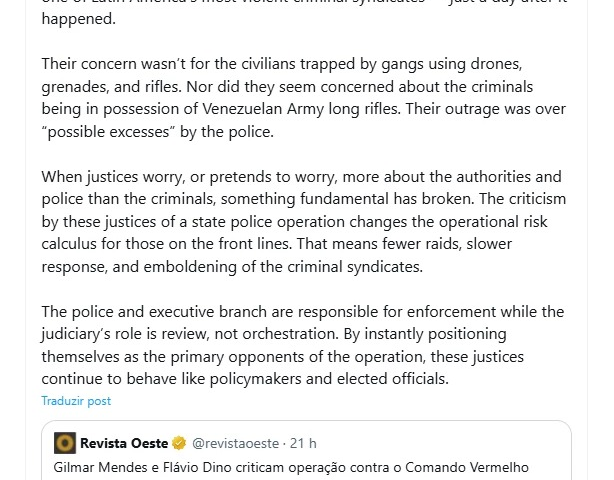 “Dois ministros do Supremo Tribunal Federal do Brasil, Gilmar Mendes e Flávio Dino, criticaram publicamente a grande operação do Rio contra o Comando Vermelho, um dos sindicatos do crime mais violentos da América Latina, apenas um dia depois de ter acontecido”, escreveu o advogado.