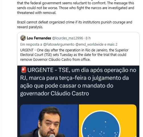 “Um dia depois de o governador do Rio liderar a maior operação do Brasil contra o Comando Vermelho, grupo que os EUA estão considerando designar como organização terrorista estrangeira, o TSE, composto por ministros do STF, repentinamente marca seu julgamento para possível destituição do cargo.”