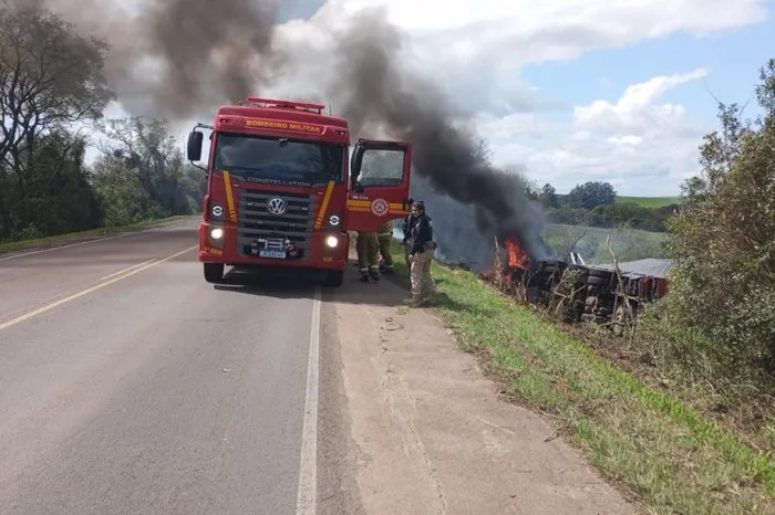 Motorista de carreta morre após veículo tombar e pegar fogo na BR-290, em Cachoeira do Sul