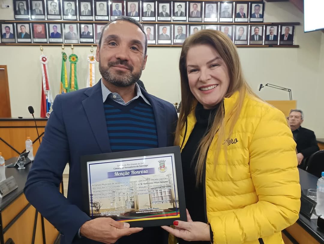 Na última segunda-feira (4), a Câmara de Vereadores de Santiago entregou uma Menção Honrosa ao Delegado de Polícia Regional Guilherme Milan Antunes, titular da 21ª Região Policial, em reconhecimento à sua atuação exemplar no combate à criminalidade e na gestão eficiente das delegacias sob sua responsabilidade.