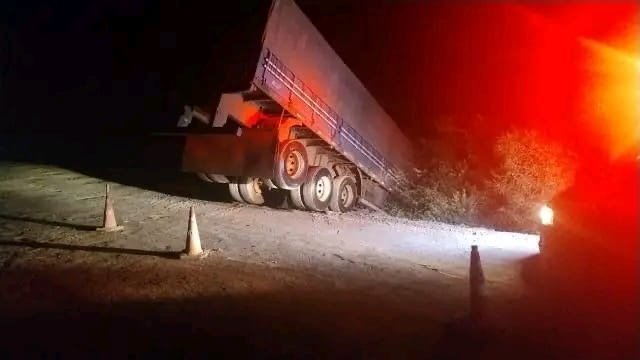 Carreta de São Borja sai da pista no desvio da ponte do Rio Toropi na BR-287; motorista sofre ferimentos leves