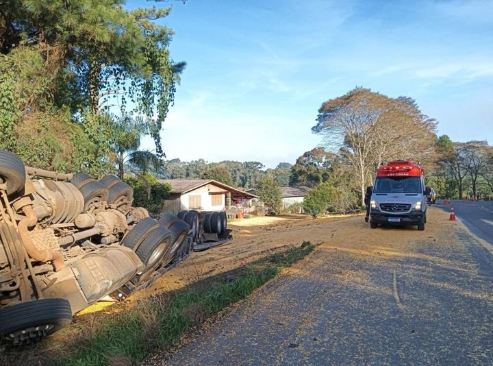 Uma carreta tombou na manhã desta quarta-feira (12) na RSC-153, bloqueando completamente o trânsito nos dois sentidos da rodovia. A Brigada Militar, por meio do Comando Rodoviário, esteve no local para atender a ocorrência e orientar o trânsito. O condutor da carreta não sofreu ferimentos, mas o veículo permanece atravessado na pista, impedindo a passagem de outros motoristas no trecho onde se inicia uma terceira faixa.