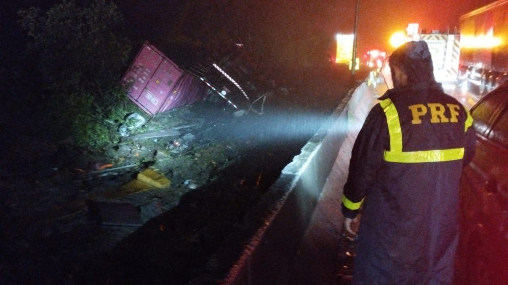 Carreta container tomba sobre van e m4ta pelo menos seis pessoas de equipe de remo na BR-376 no Paraná