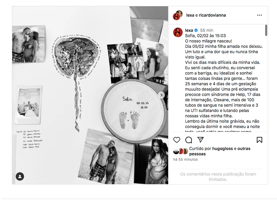 Nesta segunda-feira (10), Lexa e Ricardo Vianna anunciaram a morte de Sofia, filha do casal. A bebê nasceu prematura, em 2 fevereiro, e faleceu três dias depois, na última quarta-feira (5).