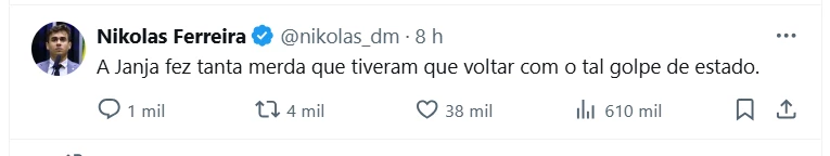 – A Janja fez tanta m**** que tiveram que voltar com o tal golpe de estado – escreveu o deputado mineiro.