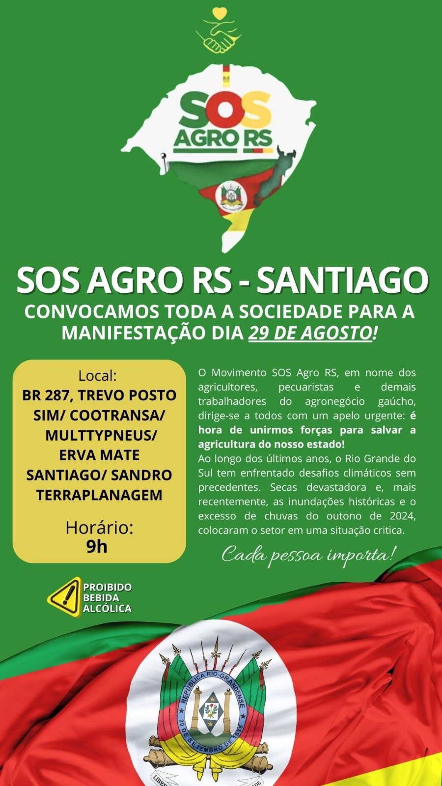 Em resposta a essa crise, o movimento está organizando uma manifestação que ocorrerá na próxima quinta-feira, 29 de agosto, na BR 287, no Trevo do Posto SIM/COOTRANSA/MULTTYPNEUS/Erva Mate Santiago/Sandro Terraplanagem, em Santiago. O evento começará às 9h, com uma carreata prevista para as 14h, que percorrerá as principais vias da cidade, incluindo as avenidas Aparício Mariense, Tito Beccon e Bento Gonçalves.