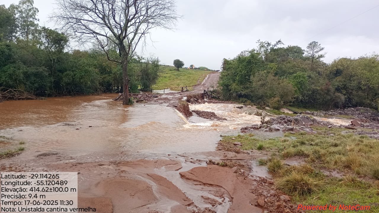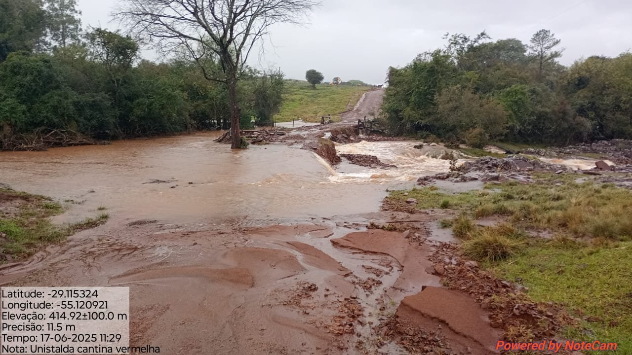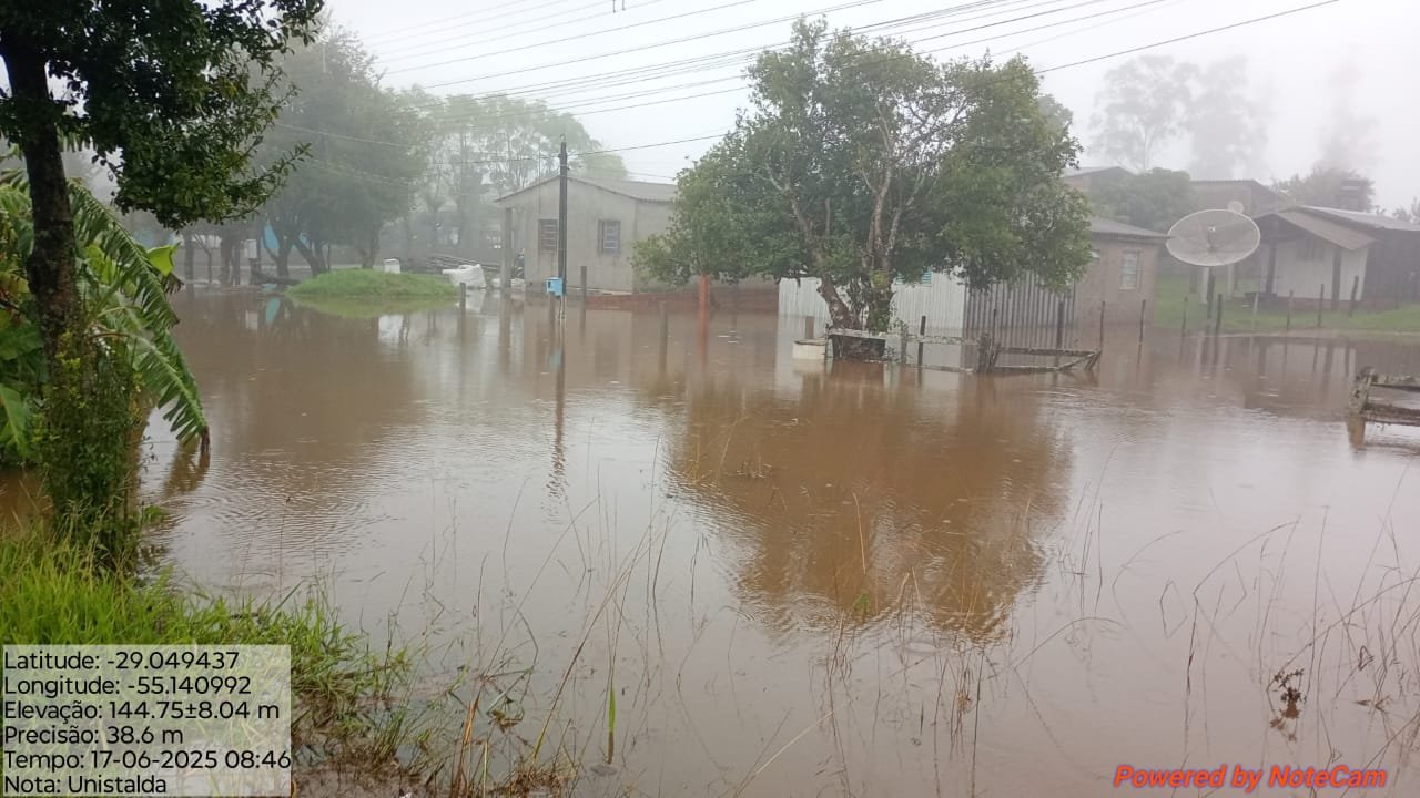 A BR-287, no acesso entre Santiago e Unistalda, está com trechos submersos, e a água já começa a invadir residências próximas. Famílias estão sendo assistidas pelas equipes locais: a senhora Isaura foi retirada e levada para a casa de familiares, enquanto o senhor Carlos e dona Lúcia Antunes estão sob monitoramento.