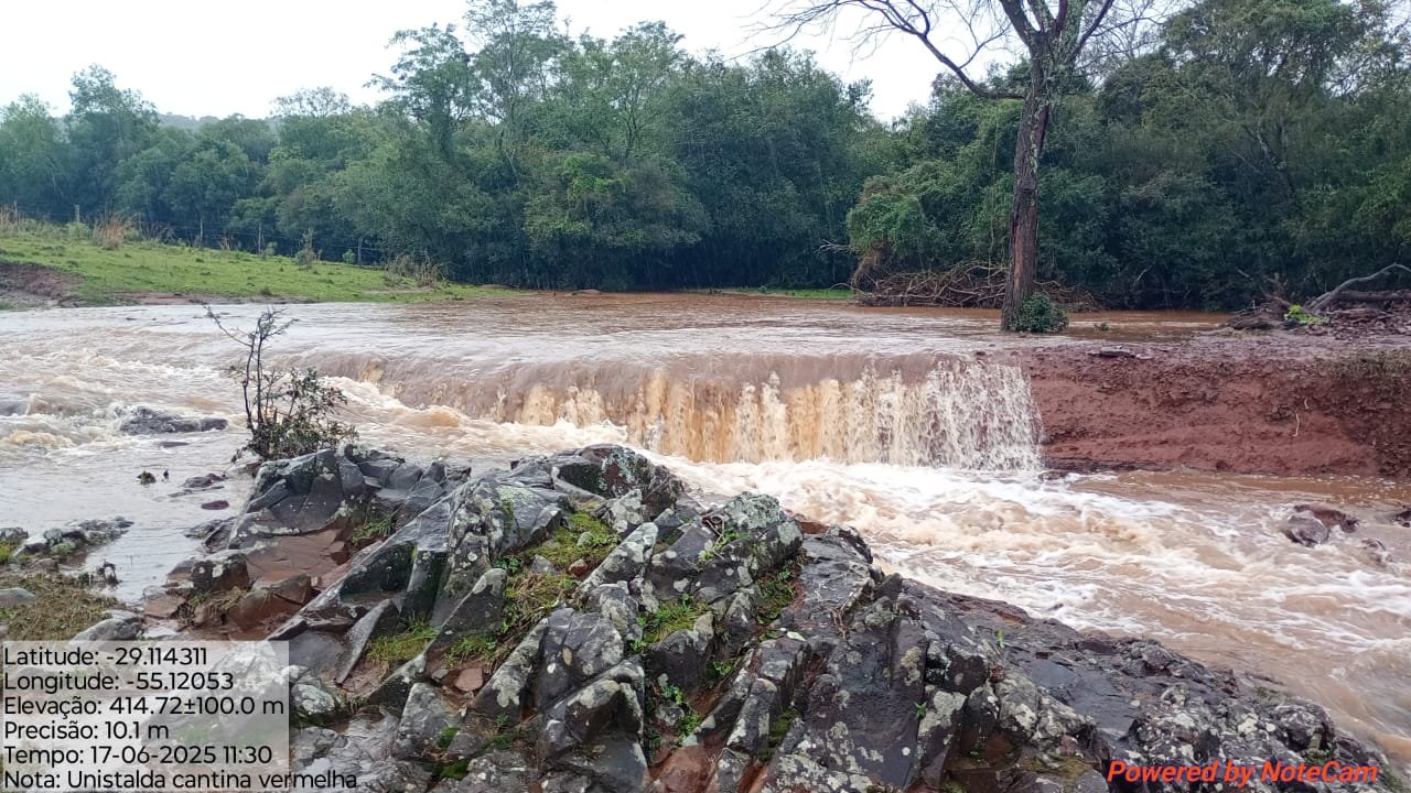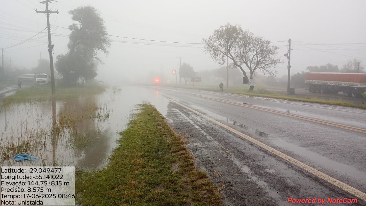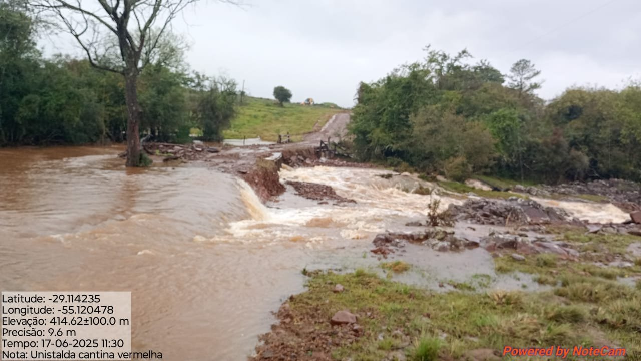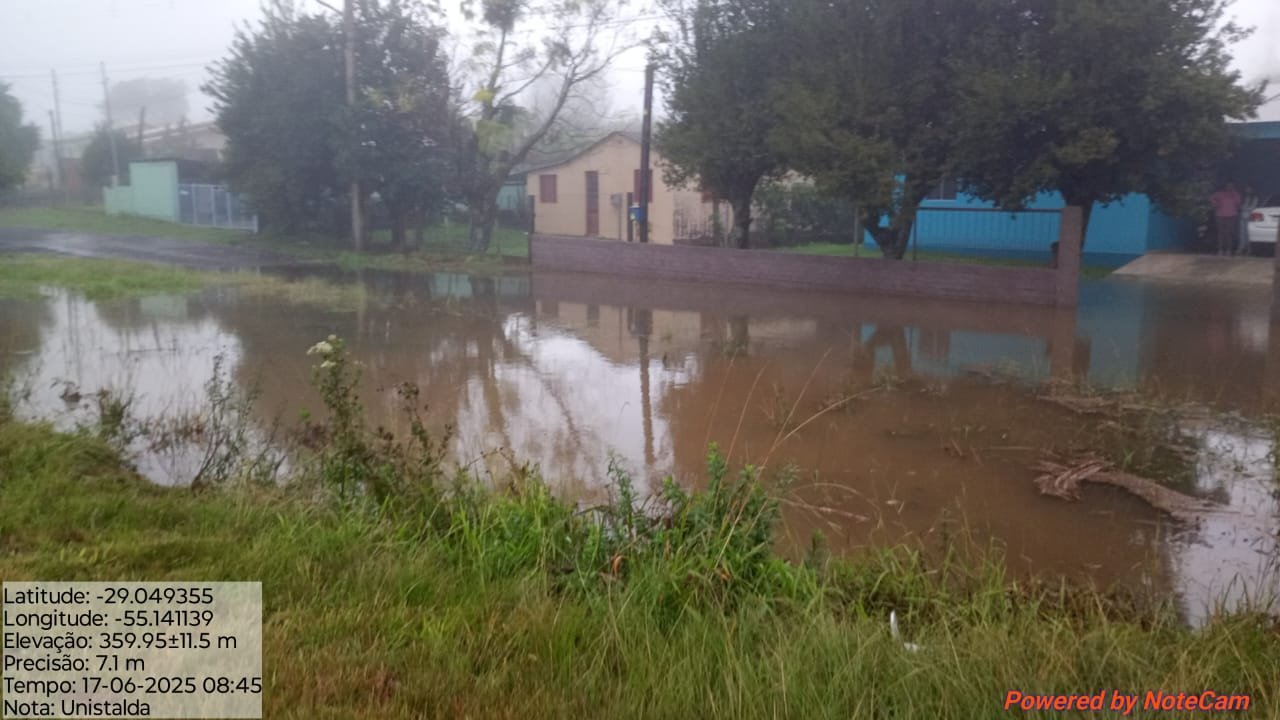 A BR-287, no acesso entre Santiago e Unistalda, está com trechos submersos, e a água já começa a invadir residências próximas. Famílias estão sendo assistidas pelas equipes locais: a senhora Isaura foi retirada e levada para a casa de familiares, enquanto o senhor Carlos e dona Lúcia Antunes estão sob monitoramento.