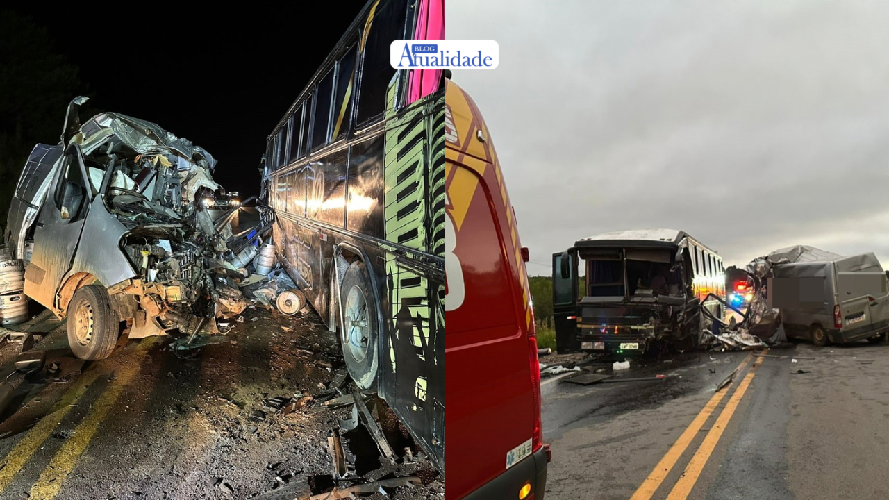 Motorista de van morre em colisão contra ônibus de banda na BR-470; FOTOS