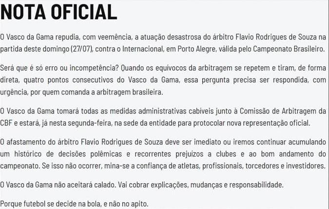 O Vasco da Gama divulgou uma nota oficial neste domingo (27), após o empate por 1 a 1 contra o Internacional, no Beira-Rio, pelo Campeonato Brasileiro. No comunicado, o clube carioca condena com veemência a atuação do árbitro Flavio Rodrigues de Souza, classificando-a como “desastrosa” e responsabilizando diretamente a arbitragem pela perda de pontos recentes.